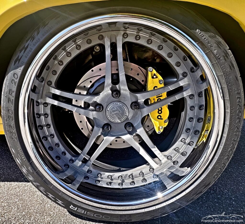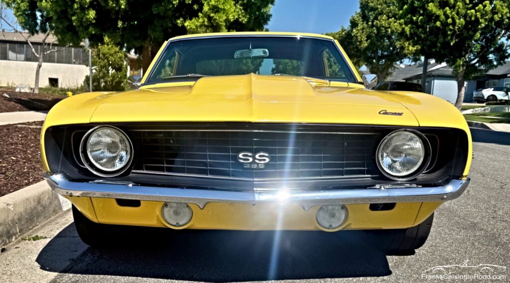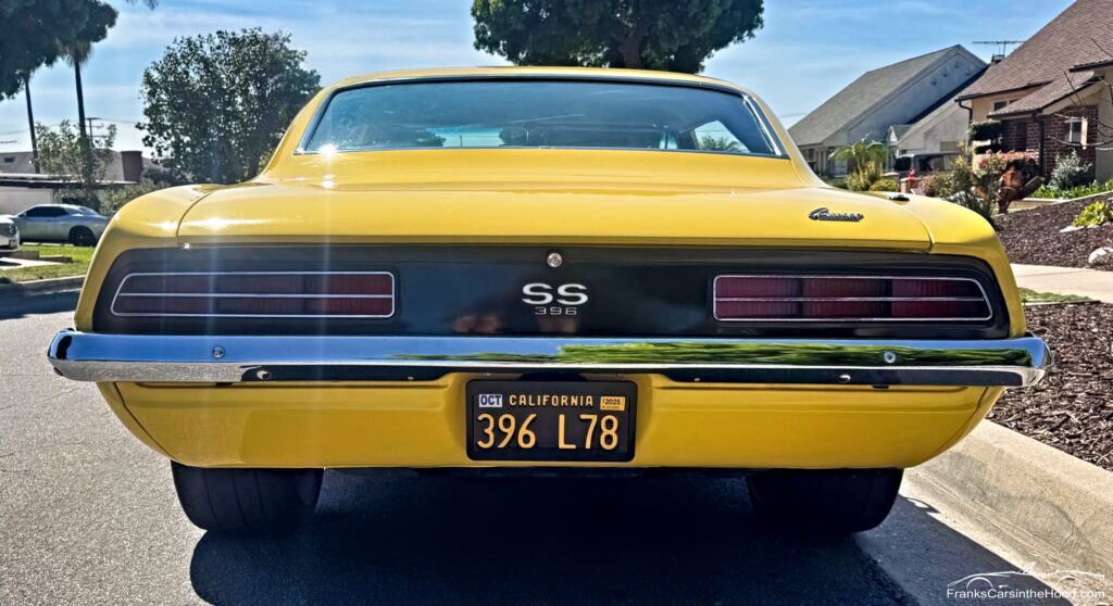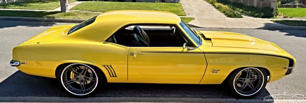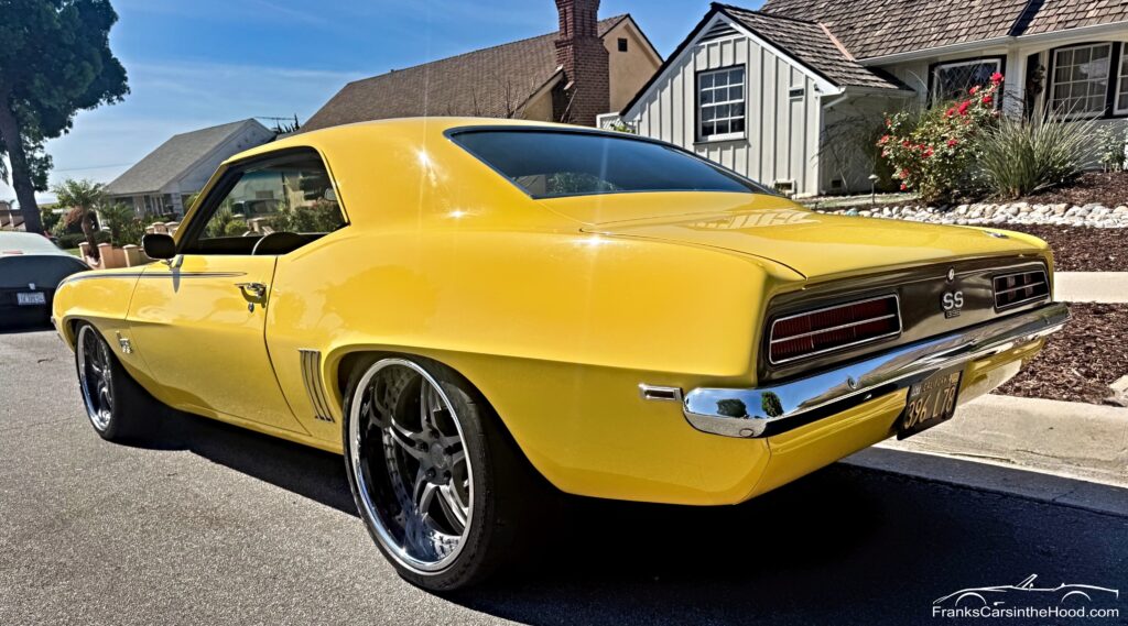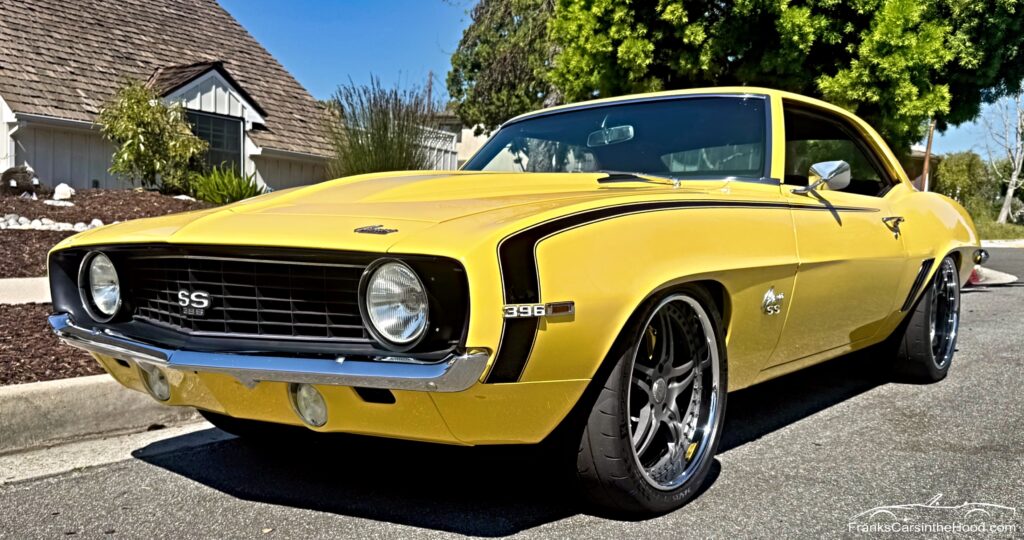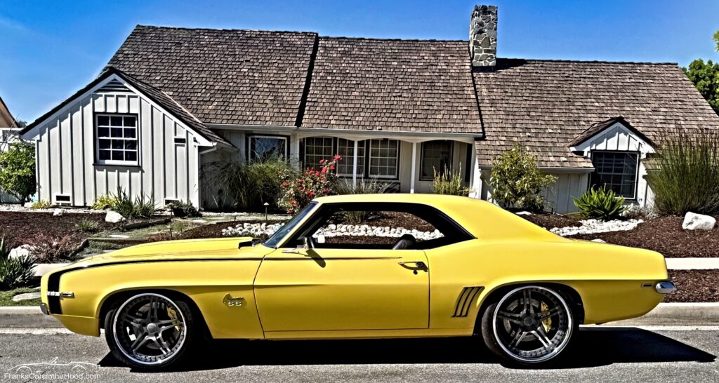 Today’s car is a 1969 Chevrolet Camaro owned by Ronnie Smith, which I photographed at his home after a Net Cruze Cars & Coffee event held at the Ladera Senior Citizen Center in Los Angeles, CA. It’s finished in its original factory Daytona Yellow with black stripes and a black interior. It was originally equipped with the L78 396 cubic inch big-block V8 rated at 375 horsepower, one of Chevrolet’s top performance engines for the Camaro in 1969. Today, it is powered by a Chevrolet Performance ZZ502 crate engine, a 502 cubic inch big-block V8 with a full roller valvetrain, a Holley carburetor, and a more street-friendly 9.0:1 compression ratio, replacing the original high-compression 12.5:1 engine that required race fuel. It is mated to a Tremec TKX 5-speed manual transmission, while the original 12-bolt Positraction rear axle remains in place with a 3.73:1 gear ratio. Braking is handled by Wilwood four-wheel disc brakes, with six-piston calipers in the front and four-piston calipers in the rear, all in a manual (non-power) configuration. The suspension consists of independent front suspension with coil springs and control arms, and a rear live axle with semi-elliptic leaf springs. The car is equipped with power steering, Vintage Air air conditioning, and Dakota Digital gauges, blending modern drivability with a largely stock appearance. It sits on True Forged 19-inch wheels up front and 20-inch wheels in the rear, wrapped in Hoosier TrackAttack Pro tires, giving the car a more aggressive stance and the grip to match its big-block power.